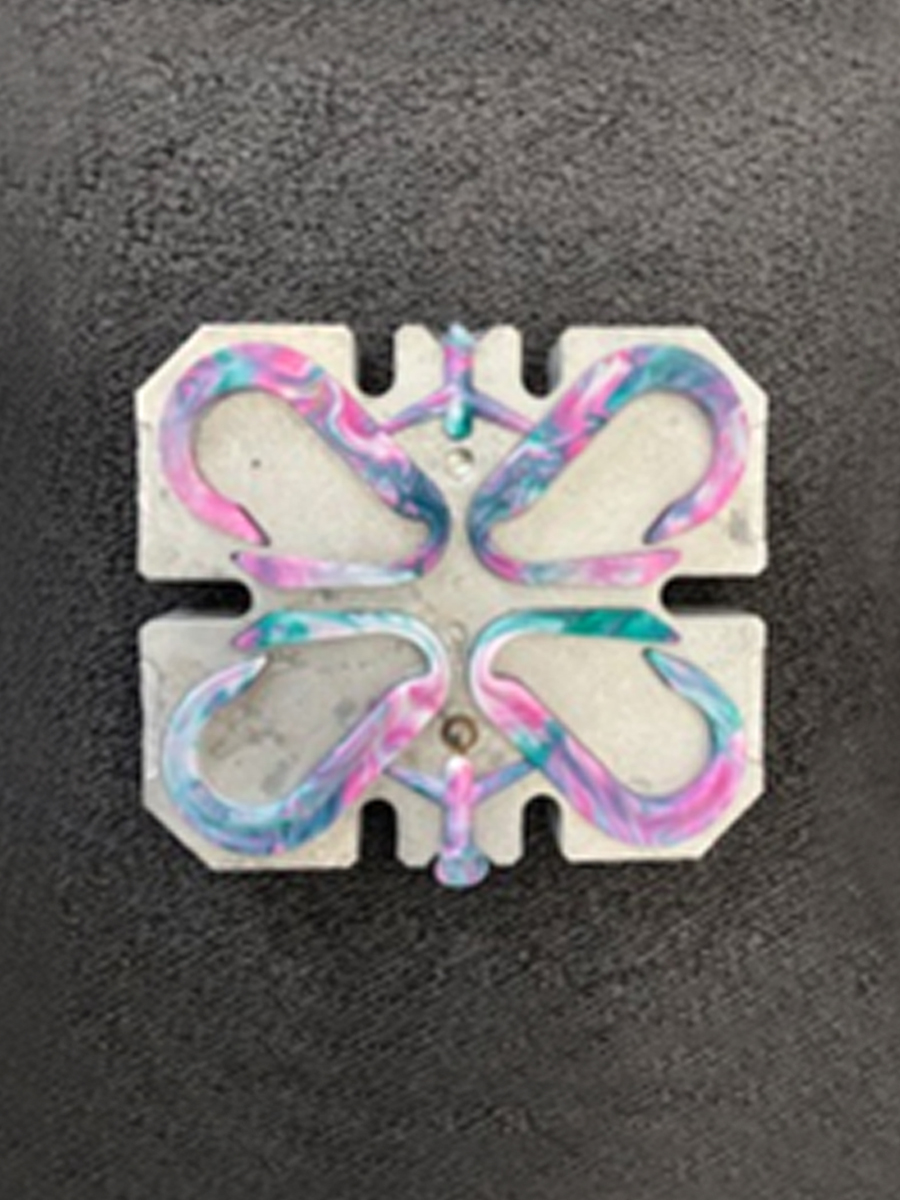 小学生が手動の成型機で溶けたプラスチックの成型を体験